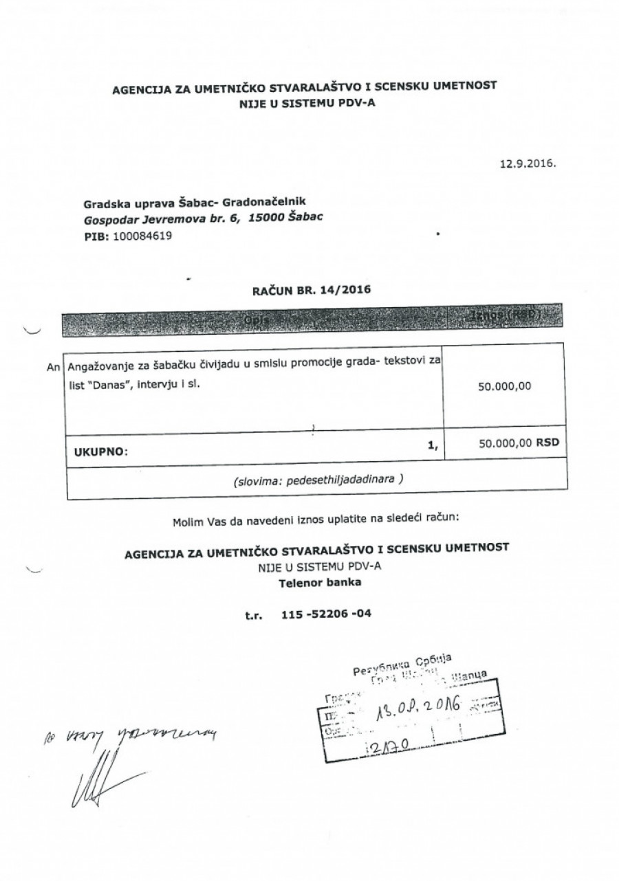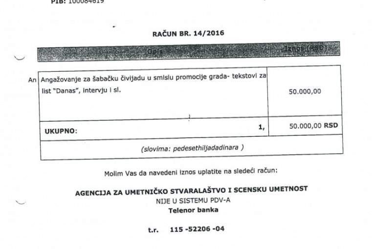 Šta je sve Šabac plaćao voditelju* učestvovanje na Sajmu vina * Festival evropskog filma * priprema za posetu kanadskog ambasadora, promocija grada * aktivnosti vezane za šabački letnji festival * angažovanje za šabačku čivijadu u smislu promocije grada - tekstovi za list Danas, intervju i sl. * Čivijada - internet-prezentacija šabačkog vašara * usluge prevodioca * aktivnosti vezane za dolazak grčkog konzula, materijal, pokloni |