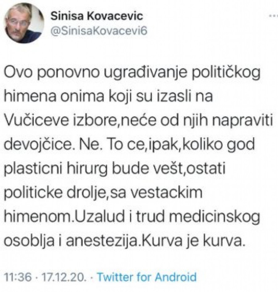 - Ovo ponovno ugrađivanje političkog himena onima koji su izašli na Vučićeve izbore, neće od njih napraviti devojčice. Ne. To će, ipak, koliko kod plastični hirurg bude vešt, ostati političke drolje, sa veštačkim himenom. Uzalud i trud medicinskog osoblja, i anestezija. Kurva je kurva - poručio je Đilasu Siniša Kovačević.