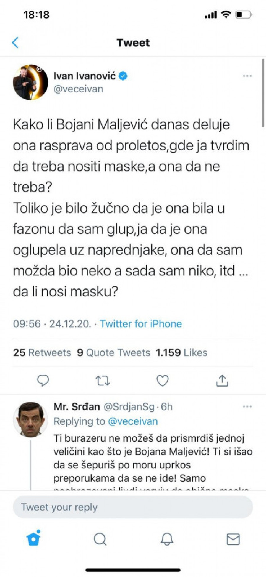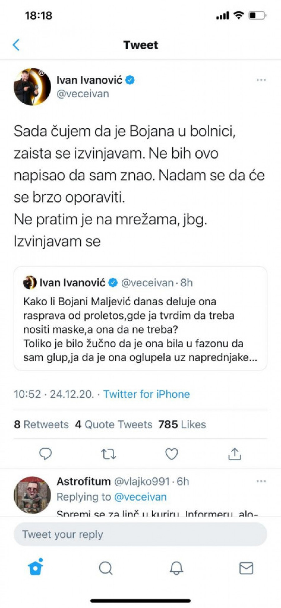 Nakon što je objavio post, usledila je besna reakcija komentatora na Tviteru koji su za Ivanovića rekli da nema ni trunke morala, čovečnosti i saosećanja jer se Bojana Maljević nalazi u bolnici zbog komplikacija sa koronavirusom.