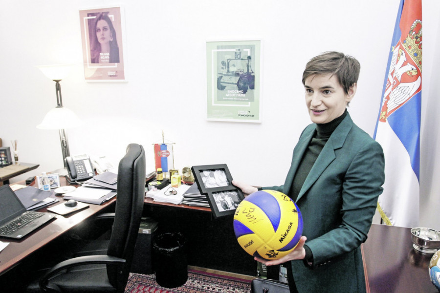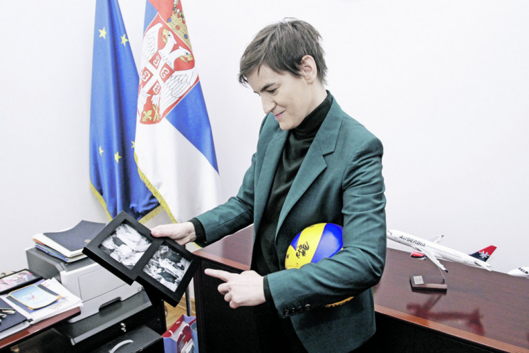 Šal reprezentacije i Trampova slikaMeđu suvenirima koje čuva u kabinetu je i šal reprezentacije Srbije. Sa ponosom pokazuje poklone koje je dobila, tu su lopte sa potpisima igrača. Posebno mesto zauzima uramljen crtež koji je dobila od građana. Uz ovaj crtež počasno mesto zauzima fotografija na kojoj srpska premijerka stoji u društvu američkog predsednika Donalda Trampa. |