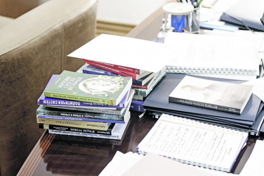 Sa Vučićem na vezi svaka dva sataKoliko se često čujete sa Vučićem? - Na svaka dva sata, što zbog ekonomije, ali najčešće zbog situacije sa koronom, kada znate podatke, kada znate koliko je naših lekara na respiratorima, da su to ljudi koji su žrtvovali svoje živote... Čitate nekoliko knjiga istovremeno, koja je trenutno literatura na vašemstolu? - Uvek ima dosta knjiga na mom stolu. Tu je Desanka Maksimović, ali ljudi uglavnom prvo primete knjigu o Aleksandru Vučiću, istorijske knjige o Srbiji.. |