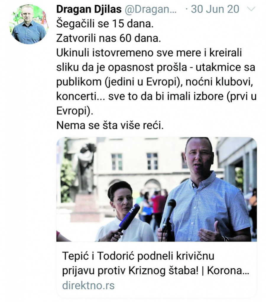 1. BORCI ZA ZDRAVLJE, BORCI ZA KORONUNa Zapadu se epidemiološke mere svakodnevno pooštravaju, a u Srbiji strukture sa Zapada finansiraju okupljanja na kojima se širi zaraza. Veliki broj ljudi koji se u kolonama tiskaju jedni uz druge i skandiraju ne može da zaštiti ni maska koju nose, budući da prostora za fizičku distancu nema. 2. STRANI FINANSIJERIGrađanska inicijativa Ne davimo Beograd podržala je i promovisala organizovanje protesta. Finansiraju se iz inostranstva, što potvrđuje činjenicu da Zapadu ne smeta održavanje ovih protesta u Srbiji, budući da je reč o Srbiji. 3. GUŠE PROTESTEAmerike, Francuska, Nemačka, Španija i Rusija brutalno guše ovakve proteste. Širom sveta brutalnom akcijom policije ovakva okupljanja su razbijena, u Srbiji ne smetaju niti iko od čelnika Evrope osuđuje ovakva okupljanja u Srbiji. 4. VIČU LOPOVI, A ONI MEĐU NJIMAOkupljaju se ispred Narodne skupštine, zahteve dostavljaju Vladi, skandiraju: "Lopovi", a među njima šetaju predstavnici nekadašnje vlasti, koji, po ovom pitanju, nisu ništa uradili, već su dugogodišnji problem aerozagađenja samo prebacili na aktuelnu vlast. 5. MEDIJSKA PRATNJAMediji koji su direktno izveštavali sa protesta i davali podršku ovom okupljanju su Direktno.rs, N1, Nova, a upravo je za portal Direktno.rs izjavu sa pomenutih protesta dao Lutovac, što pokazuje da je reč o političkom protestu, |