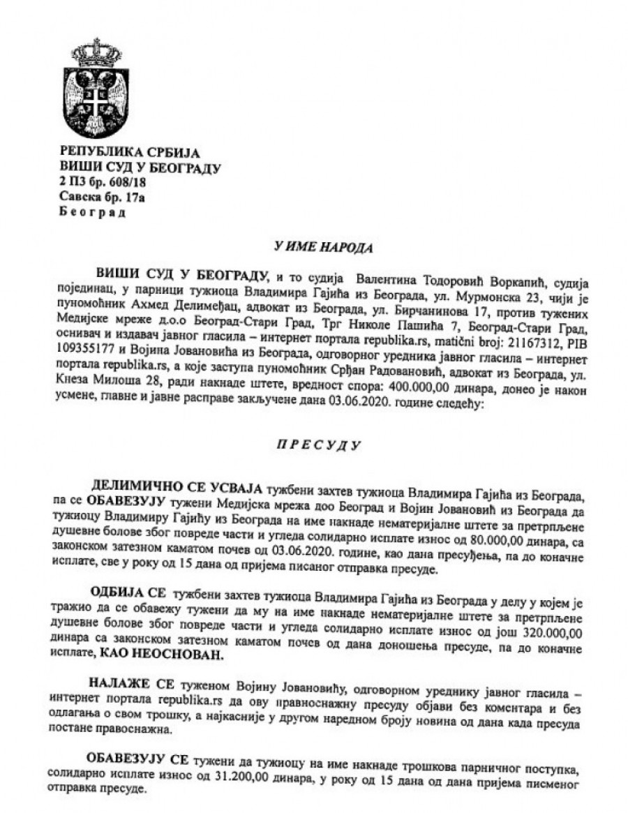 Redakcija portala Republika objavljuje presudu Višeg suda u parnici koju je tužilac Vladimir Gajić pokrenuo protiv Medijske mreže d.o.o.
