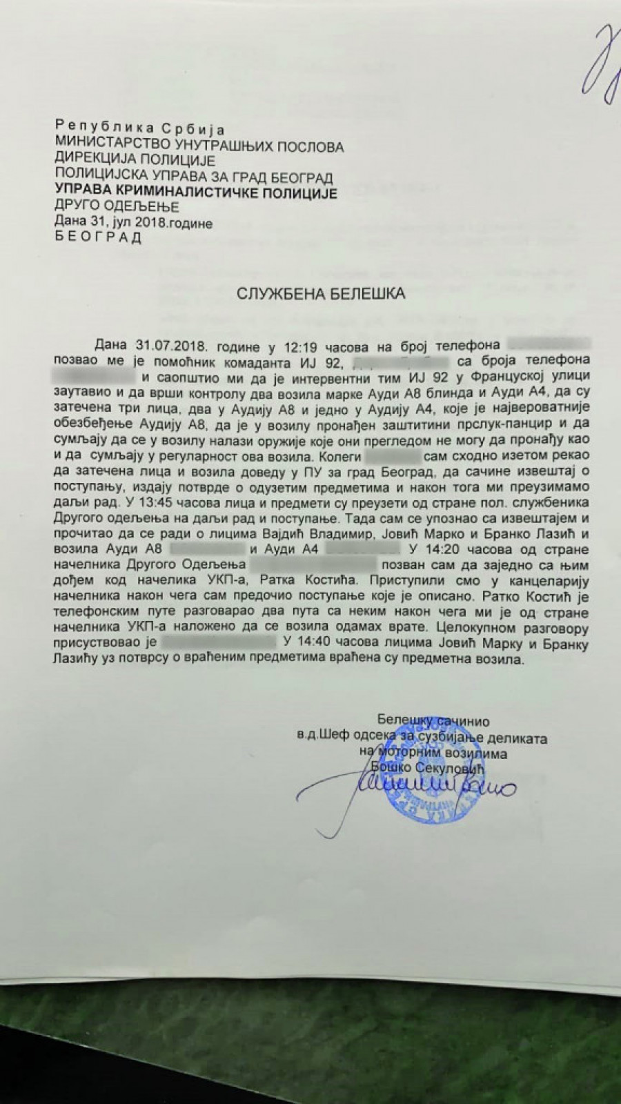 - Sva trojica su privedena u prostorije SUP Novi Beograd, a auto je predat na drugo odeljenje, odseku za motorna vozila. Posle od 15 do 20 minuta tadašnji načelnik Ratko Kostić pozvao je šefa odseka Boška Sekulovića i naredio mu da se vozilo odmah vrati, uz obrazloženje da je to tražila Dijana Hrkalović. Međutim, Sekulović je vraćanje uslovio službenom beleškom koju bi Sekulović potpisao, na šta mu je ovaj rekao: "Radi šta hoćeš, samo vrati vozilo" - iznosi detalje sagovornik Srpskog telegrafa.