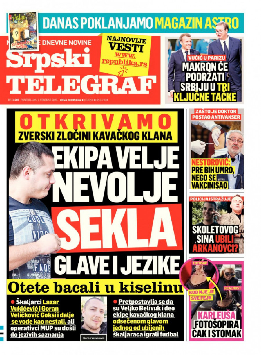 - Sumnja se da su otmičari Lazara Vukićevića namamili tako što su uzeli skaj od takođe otetog "škaljarca" Damira Hodžića iz Bara i poslali mu sliku vezanog Velje Nevolje. Lazar je tada rekao drugarima: "Idem da se obračunam ili su me namestili." Otad mu se gubi svaki trag, a prema saznanjima iz istrage njemu je živom odsečen jezik, a potom je ubijen - otkriva izvor Srpskog telegrafa.
