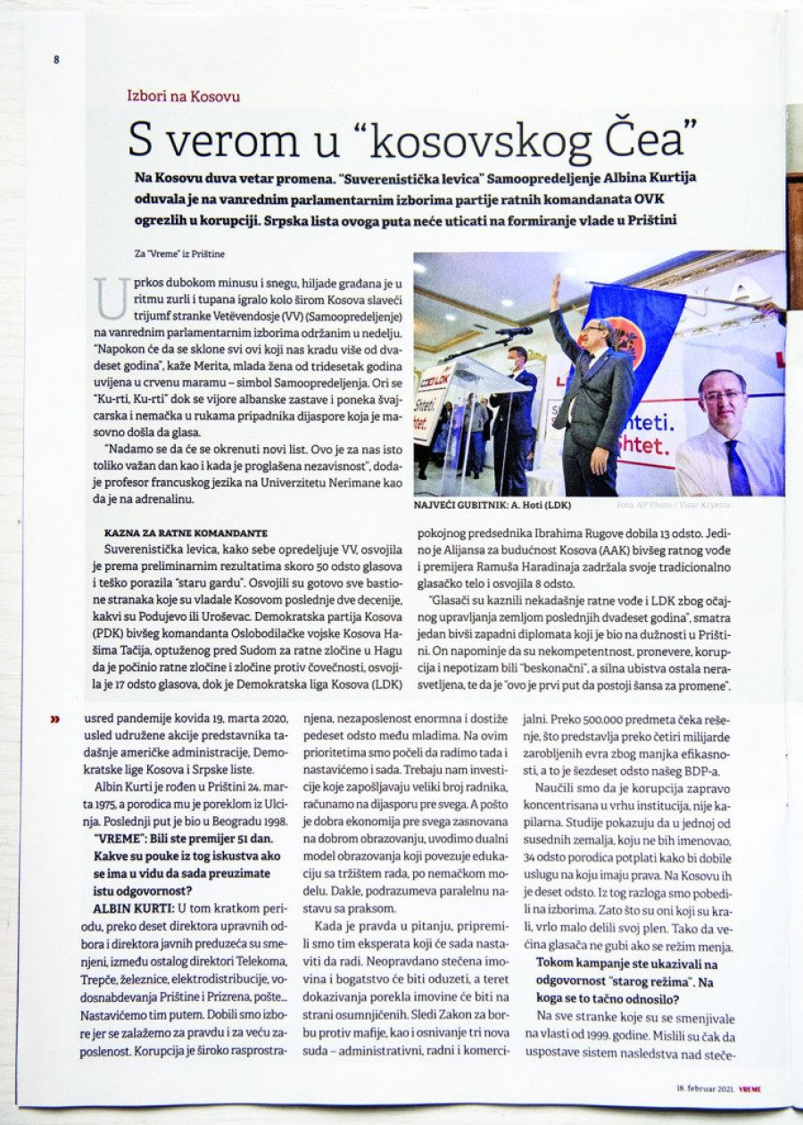 Foto: Tanjug/APNaime, u tekstu pod naslovom "S verom u 'kosovskog Čea'" Vreme analizira postizbornu situaciju na Kosovu i, između ostalog, navodi da pobeda Kurtija "donosi vetar promena". Diveći se Kurtijevoj izbornoj pobedi, Vreme piše da je lider Samoopredeljenja oduvao partije ratnih komandanata OVK, kao i Srpsku listu, koja neće imati uticaj na formiranje vlade u Prištini.