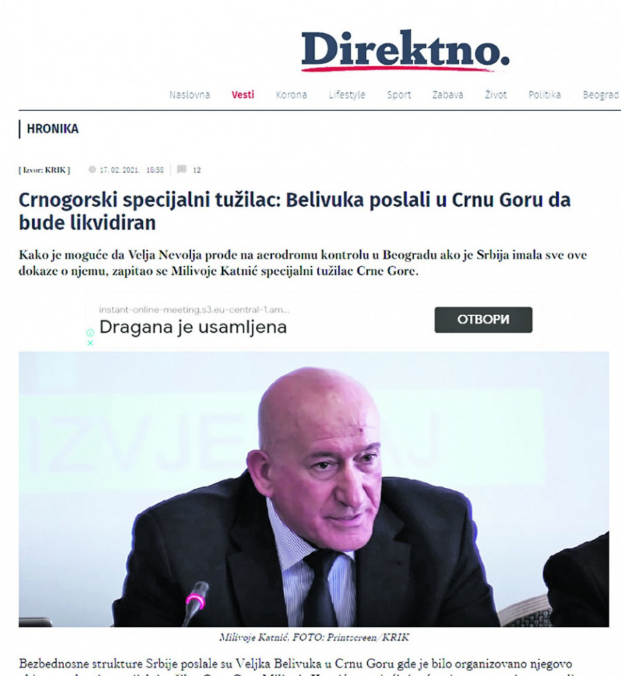 Foto: PrintscreenNe bi to ni bilo toliko strašno da se u ovom slučaju tandem Katnić-Đilas nije ustremio na vlast u Srbiji (čitaj Aleksandra Vučića), i to tako što je pokušao da vođu kriminalnog ganga Veljka Belivuka poznatijeg kao Velja Nevolja predstavi kao mučenika kog su srpske službe poslale u Crnu Goru da bi tamo bio likvidiran.