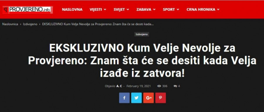 Foto: PrintscreenZloslutne poruke Velja Nevolja, kako nazivaju Belivuka, uputio je preko svog kuma, a ovaj ih je izneo u razgovoru za bosanski portal Provjereno (pogledajte printskrinove koje puštamo). Da ne bude sumnje da se zaista radi o Veljinom kumu, portal je objavio njihovu zajedničku sliku. Kumovo lice je prekriveno, a nije objavljeno ni njegovo ime, uz napomenu da su svi podaci poznati redakciji portala.