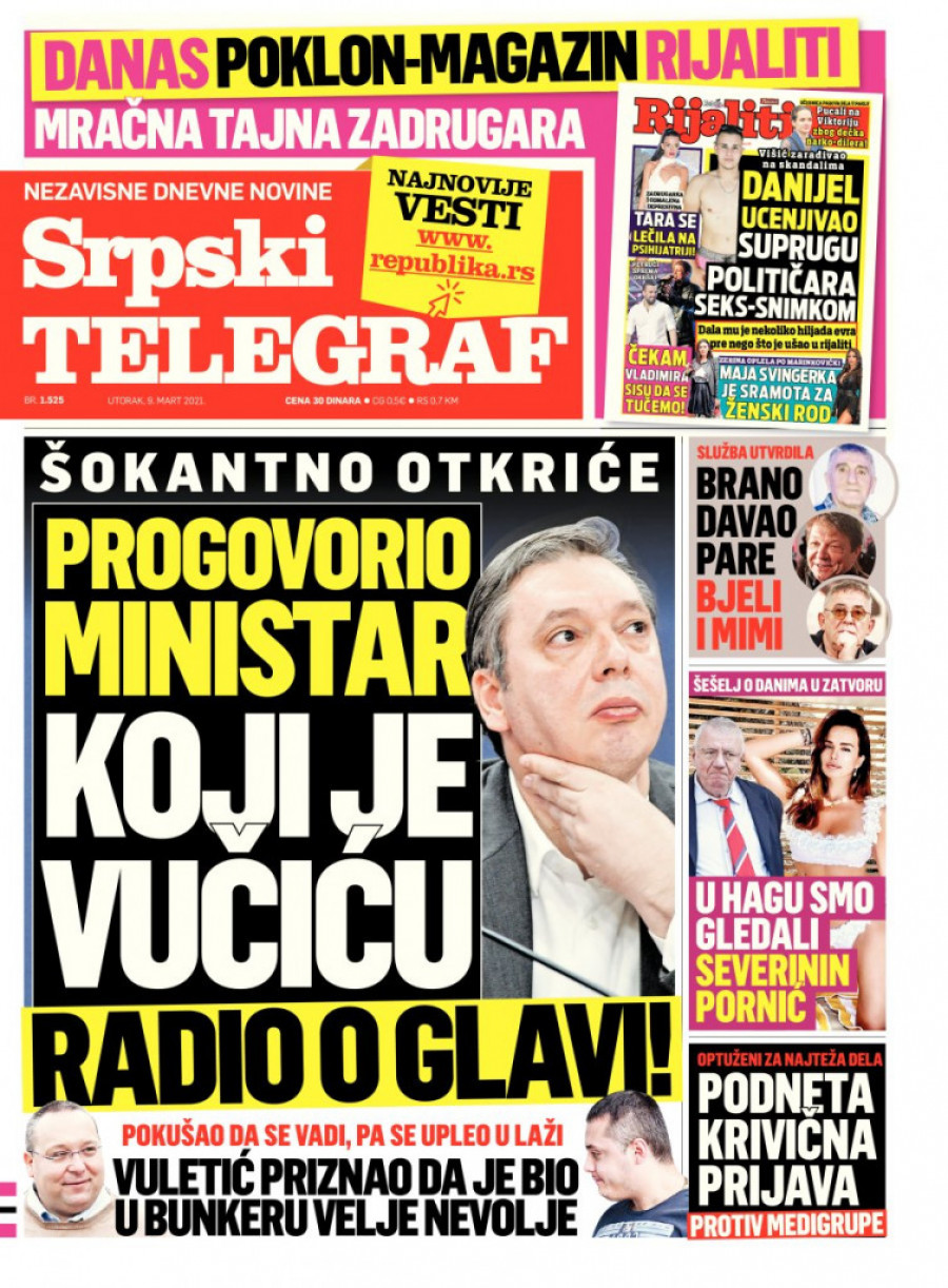 Veliki broj ekskluzivnih priča iz rubrika politike, društva, ekonomije, hronike, sveta, zabave i sporta! Očekuje vas i poklon dodatak "Rijaliti".