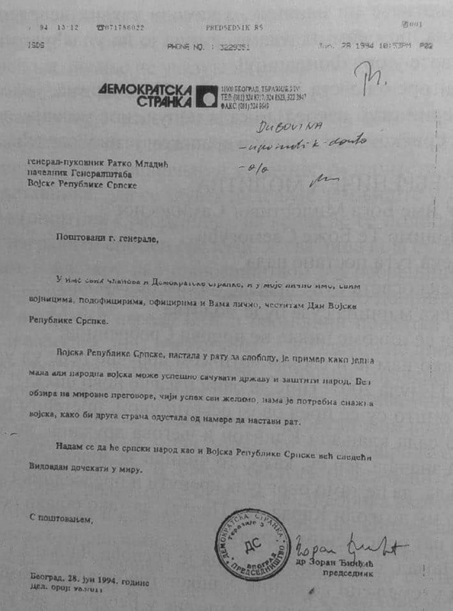 Zoran Đinđić je na Vidovdan, 28. juna 1994. godine, uputio pismo general-pukovniku Ratku Mladiću. U svom tekstu "mirovne pregovore" je stavio u drugi plan, a način na koji se obratio Mladiću ostaviće vas bez teksta.