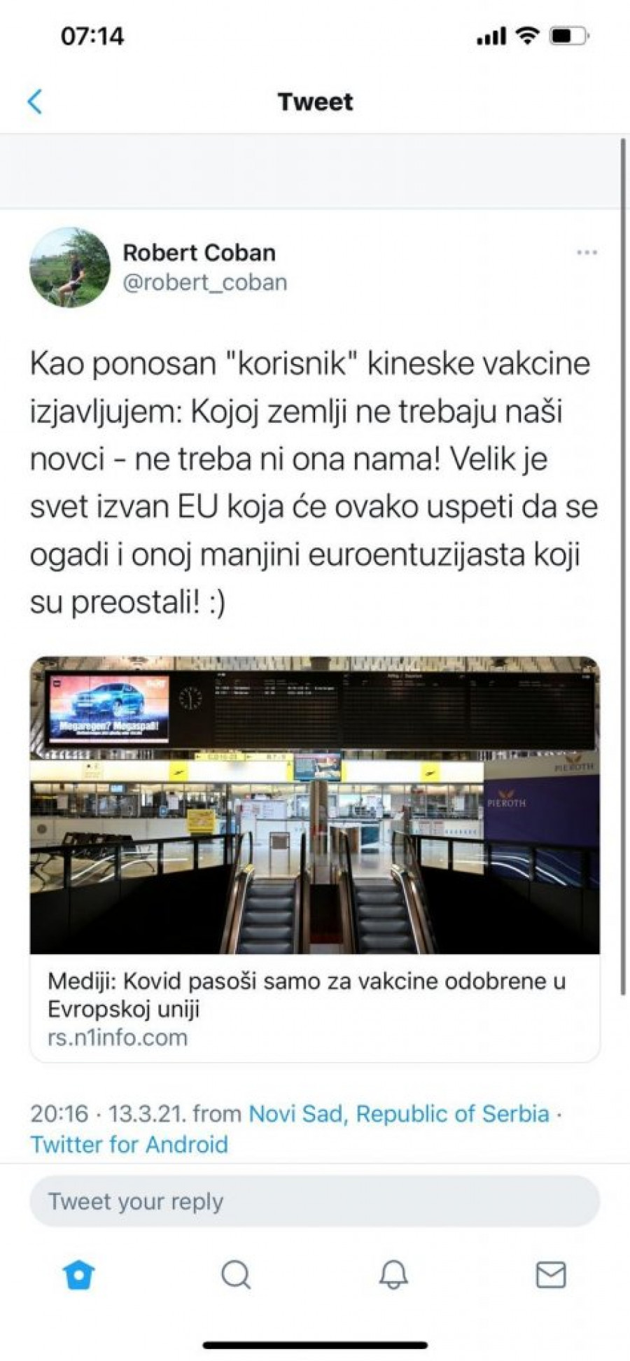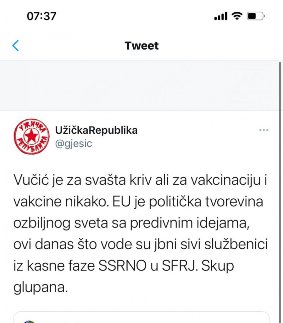 Nakon što se na Tviteru povela polemika o informacijama da će Evropska unija kovid pasoše izdavati građanima koji su primili vakcine koje je odbrila Evropska komisija za lekove, Ješić je istakao da Vučić ne može biti kriv za vakcinaciju i politiku oko imunizacije koju sprovodi Evropska unija.