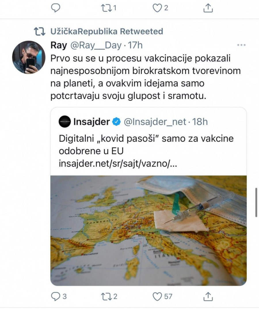 Foto: PrintscreenPotom je Ješić nastavio u istom maniru i retvitovao objavu izvesnog korisnika koji se predstavlja kao "Ray", a koji je naveo da su se čelnici Evropske unije tokom nabavke vakcina pokazali neviđeno glupim osobama.