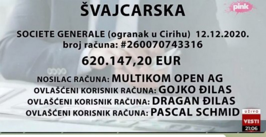 Đilas je pokušao, kako su rekli sagovornici Pinka, da poreklo novca sakrije, pa je u tu svrhu otvarao i račune u Švajcarskoj, napomenuto je u prilogu. Istaknuto je i saznanje Večernjih novosti, po kojem Đilas u Švajcarskoj ima još 4 firme, i još ko zna koliko njih u 15 država.