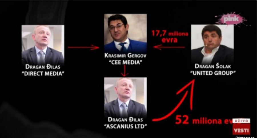 - U ovoj transakciji se pojavljuje i Dragan Šolak, vlasnik “United grupe” koji je Gergovu pozajmio 17.7 za navodnu kupovinu "Dajrekt medije". Gergov nakon toga prenosi vlasništvo bez naknade na firmu "Askanijus” za koju je utvrđeno da je u Đilasovom vlasništvu da bi se 2018. godine ponovo pojavio Dragan Šolak, vlasnik “United grupe” i sa 52 miliona evra kupio od Đilasovog “Askanijusa” famoznu Đilasovu “Dajrekt mediju” - zaključio je ministar Mali.