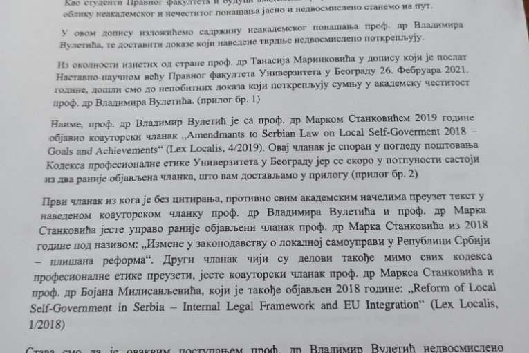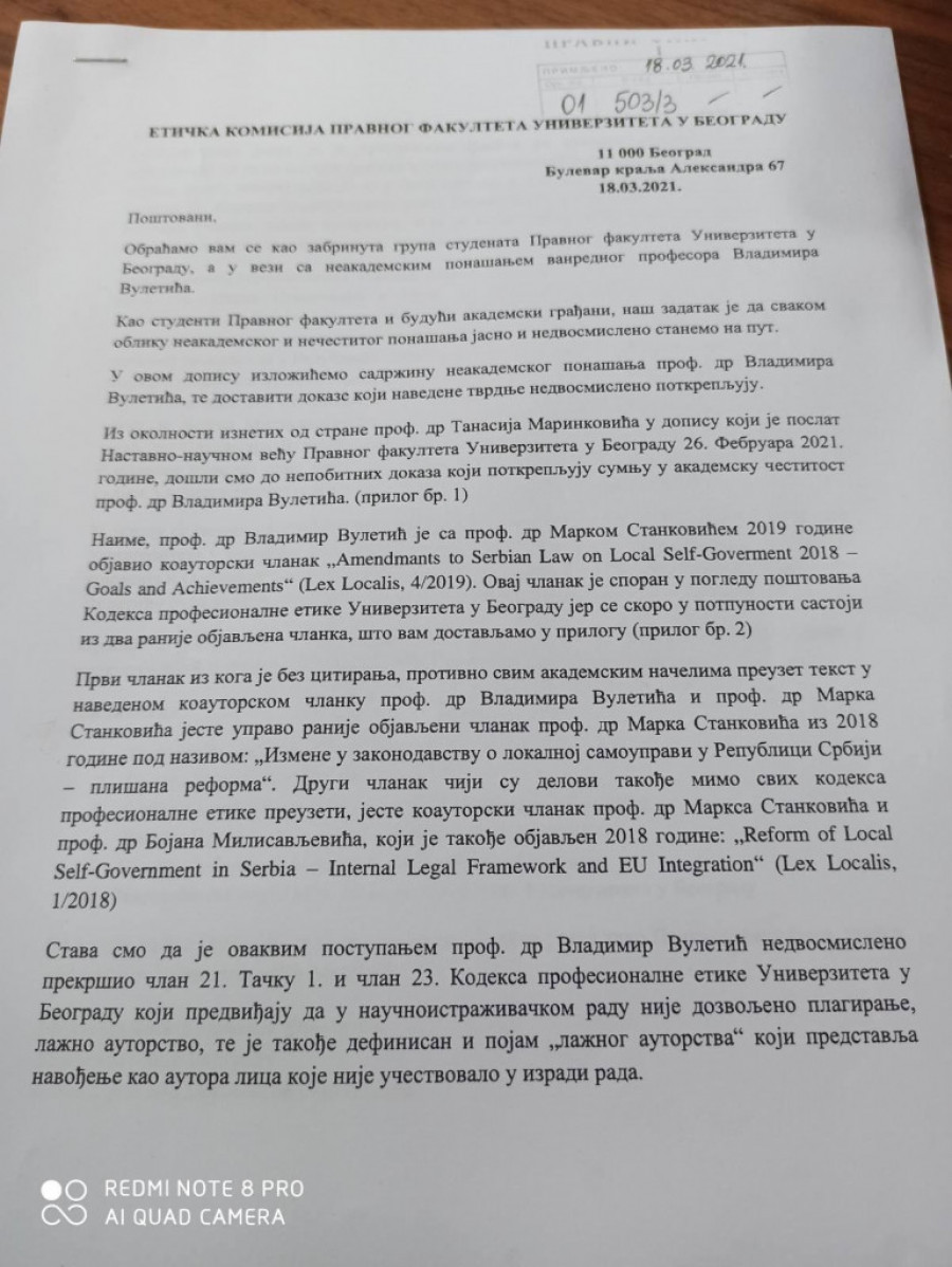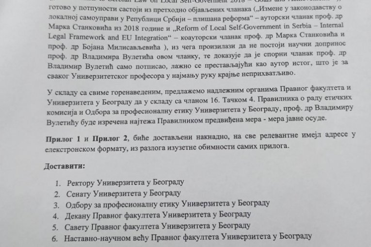 Dopis je, pored Etičke komisije Univerziteta u Beogradu, dostavljen i rektoru Univerziteta u Beogradu, Senatu Univerziteta u Beogradu, Odboru za profesionalnu etiku Univerziteta u Beogradu, dekanu Pravnog fakulteta Univerziteta u Beogradu, savetu Pravnog fakulteta Univerziteta u Beogradu i nastavno-naučnom veću Pravnog fakulteta Univerziteta u Beogradu.