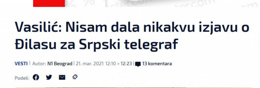 Jelisaveta Vasilić je potom brže bolje demantovala sopstvenu izjavu, kao što se vidi iz priloženog. - Povodom pisanja Srpskog telegrafa od 20. marta 2021. godine, gde je spomenuto moje ime i moja navodna izjava, navodim da nikakvu zvaničnu izjavu za taj list nisam dala - saopštila je Vasilić, a preneo portal N1.