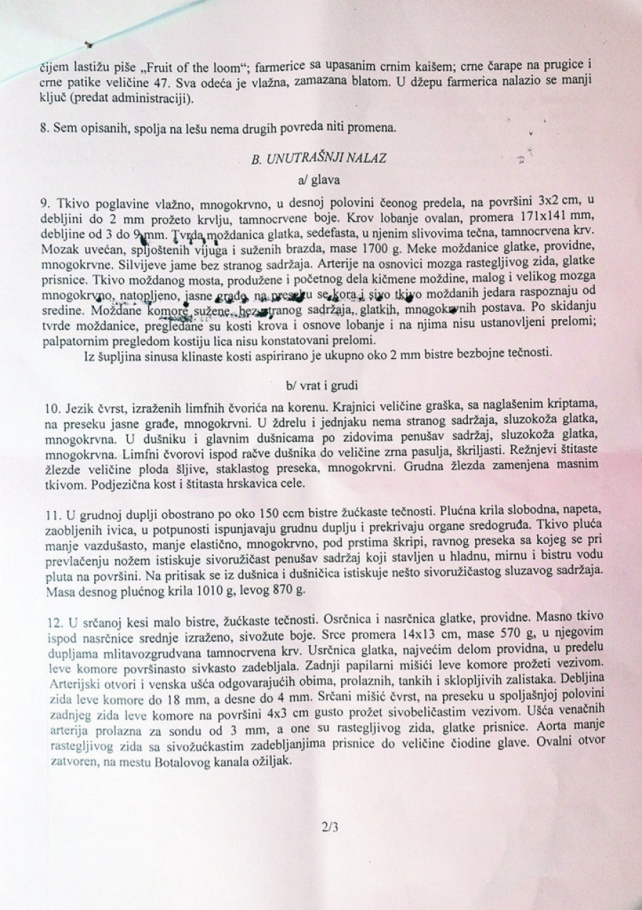 - Leš je na obdukciju dostavljen obučen u sledeću odeću: crna jakna na čijoj etiketi piše "Alpha Industries", ispod koje se nalazila još jedna crna jakna (sa debelom postavom) na čijoj etiketi piše "The image", veličine XL; bela majica kratkih rukava sa V-izrezom; muške pamučne bele slip gaće, na čijem lastišu piše "Fruit of the loom"; farmerice sa upasanim crnim kaišem; crne čarape na prugice i crne patike veličine 47. Sva odeća je vlažna, zamazana blatom. U džepu farmerica nalazio se manji ključ (predat administraciji) - konstatovano je, između ostalog, u dokumentu.