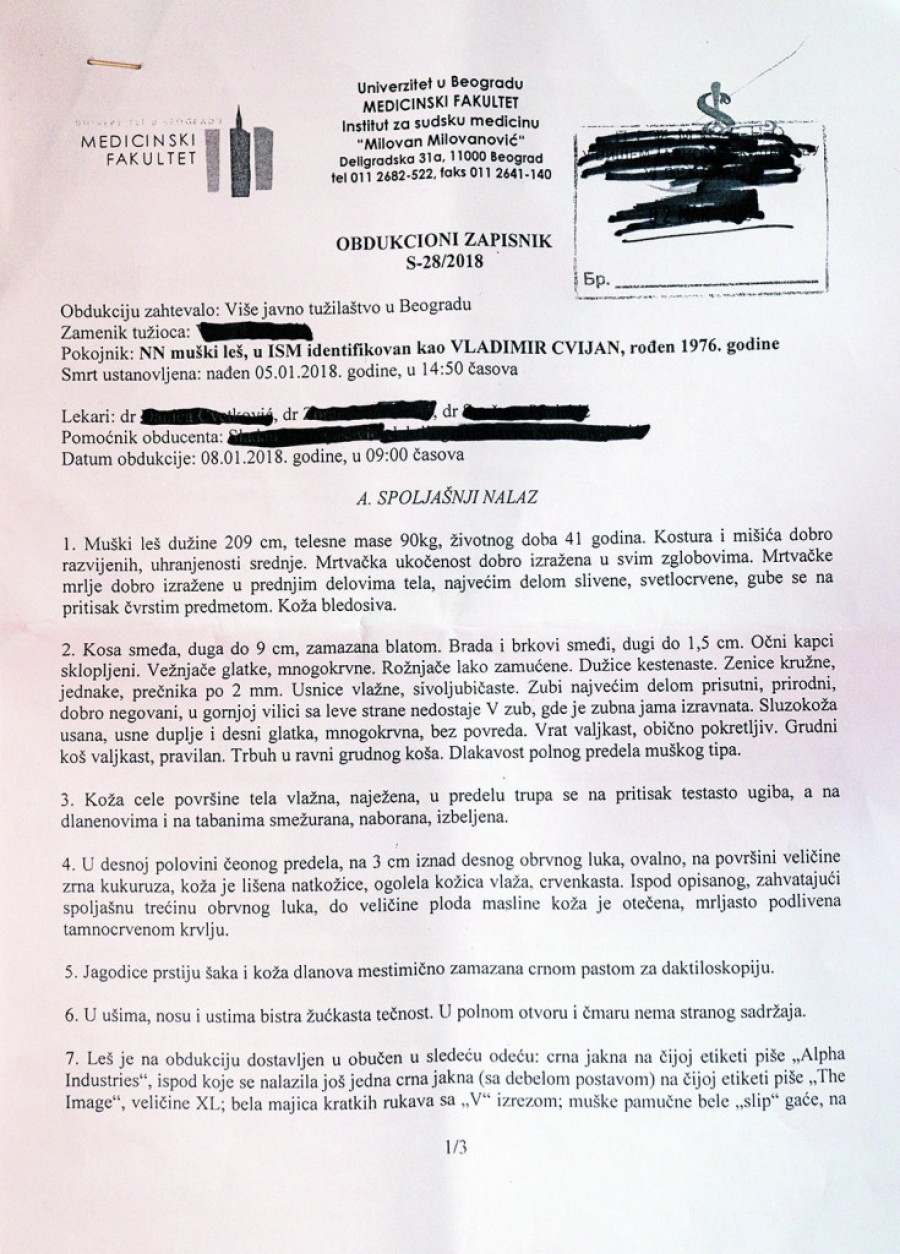 Obdukcioni zapisnik urađen je prema zahtevu Višeg javnog tužilaštva u Beogradu, koje je još pre tri godine arhiviralo predmet o smrti advokata Cvijana (pogledaj okvir).