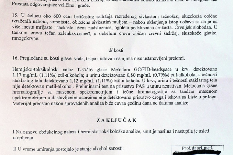 - Pregledane su kosti glave, vrata, trupa i udova i na njima nisu ustanovljeni prelomi. Hemijsko-toksikološki nalaz T-37/16 glasi: Metodom GC/FID-headspace u krvi detektovano 1,17 mg/ml (1,11%) etil-alkohola; u urinu detektovano 0,80 mg/ml (0,79%) etil-alkohola; u tečnosti staklastog tela detektovano 1,12 mg/ml (1,11%) etil-alkohola. U krvi, urinu i tečnosti staklastog tela nije detektovan metil-alkohol. Preliminarni test na prisustvo PAS u urinu negativan. Metodama gasne hromatografije sa masenom spektrometrijom i tečne hromatografije sa tandem masenom spektrometrijom u dostavljenim uzorcima nije detektovano prisustvo droga i lekova sa liste u prilogu - navedeno je u tom dokumentu.
