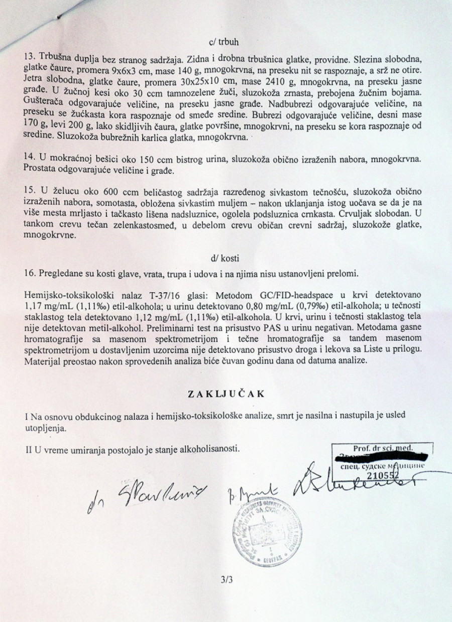 Srpski telegraf došao do nalaza obdukcije iz 2018, u kom piše da je "u vreme umiranja postojalo stanje alkoholisanosti", te da je "smrt nastupila usled utopljenja".