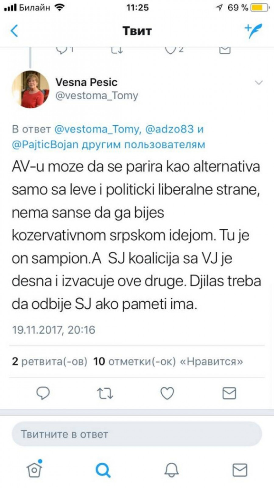 Kako priča o najavljenim gradskim izborima koji bi trebalo da budu održani u martu iduće godine, polako dolazi u sve oštriji fokus, tako se na društvenim mrežama javljaju različita mišljenja o mogućim koalicijama, kako u vlasti tako i opoziciji. Jedna od aktivnijih učesnica na tviteru je i Vesna Pešić koja je upozorila Đilasa da nikako ne ulazi u koaliciju sa Sašom Jankovićem