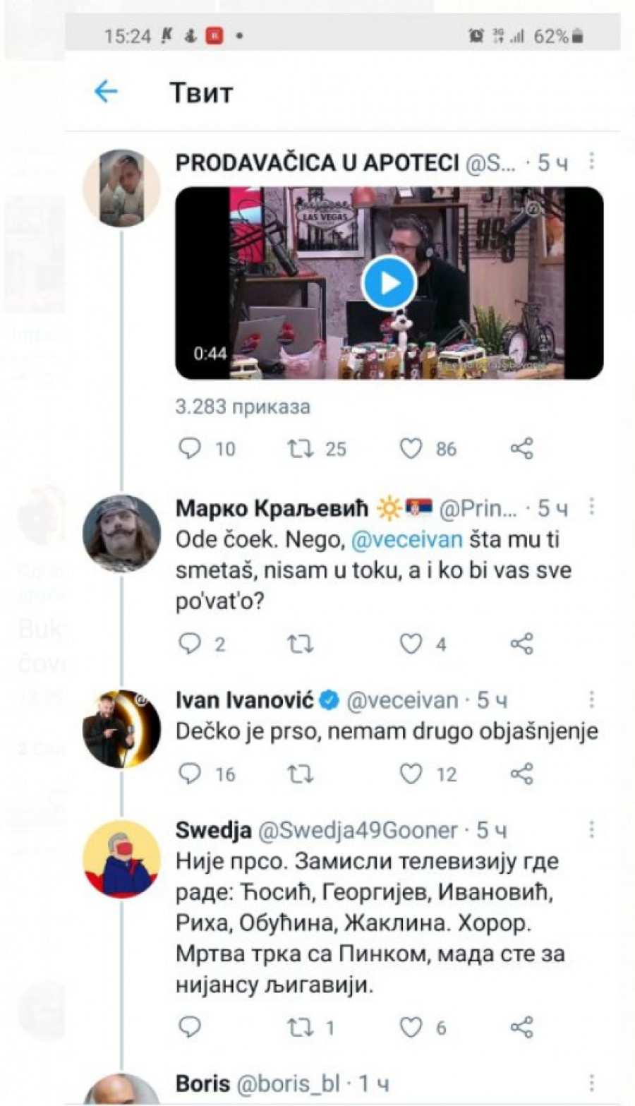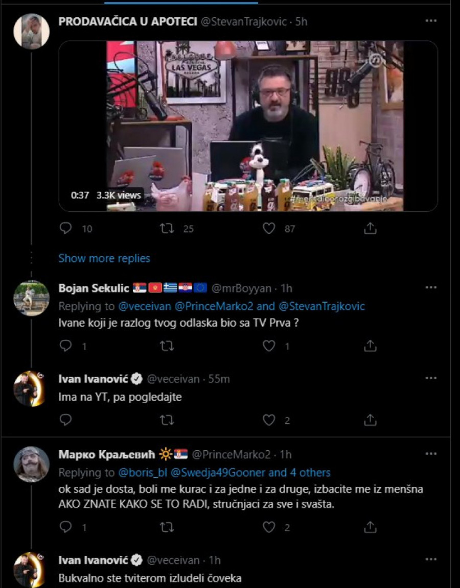 Na pitanja tviteraša da prokomentariše stavove koje je Mitrović javno izneo tokom trajanja emisije, Ivanović je poručio da je "dečko prs'o" i da on nema "drugo objašnjenje".