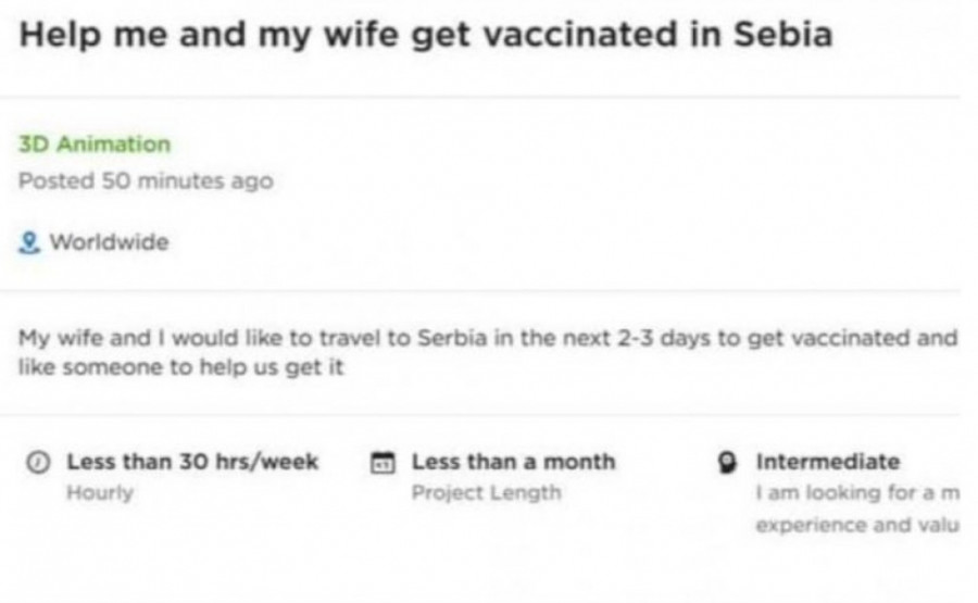 Na čuvenoj internet platformi Upwork, popularnoj među frilenserima, osvanuo je neobičan oglas bračnog para iz Japana, koji žele da se vakcinišu u našoj zemlji.