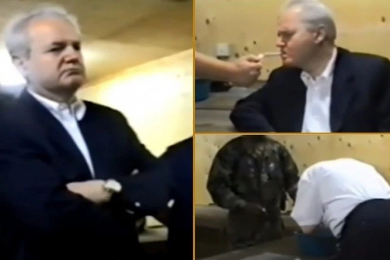 Milošević, u odelu i beloj košulji, ulazi u prostoriju u pratnji nekoliko osoba u maskirnim vojnim uniformama. Bivši predsednik SRJ je nekoliko trenutaka sedeo, potom mirno šetao po prostoriji sa rukama iz leđa, a u jednom trenutku je sa prisutnima počeo da razgovara na engleskom.