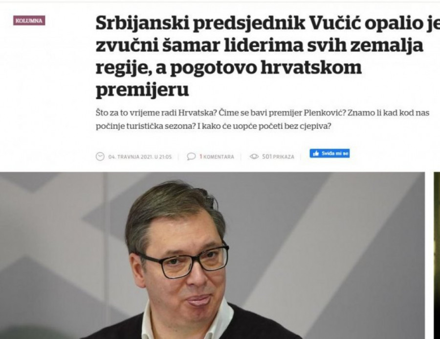 Hrvatski portal Večernji.hr pun je hvale za predsednika Srbije Aleksandra Vučića koji se sve ovo vreme trajanja pandemije bavi isključivo zdravljem ljudi i glavna preokupacija mu je kako da nabavi što veći broj vakcina protiv kovida 19.