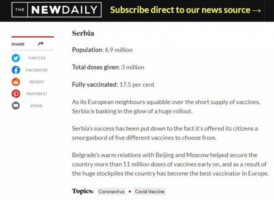 U članku pod nazivom "Šta bi Australija mogla da nauči od ovih pet zemalja", navodi se da su bliski odnosi Beograda sa Pekingom i Moskvom pomogli našoj zemlji da na vreme obezbedi više od 11 miliona doza vakcina, a kao rezultat toga Srbija je postala najbolje vakcinama opremljena zemlja u Evropi.
