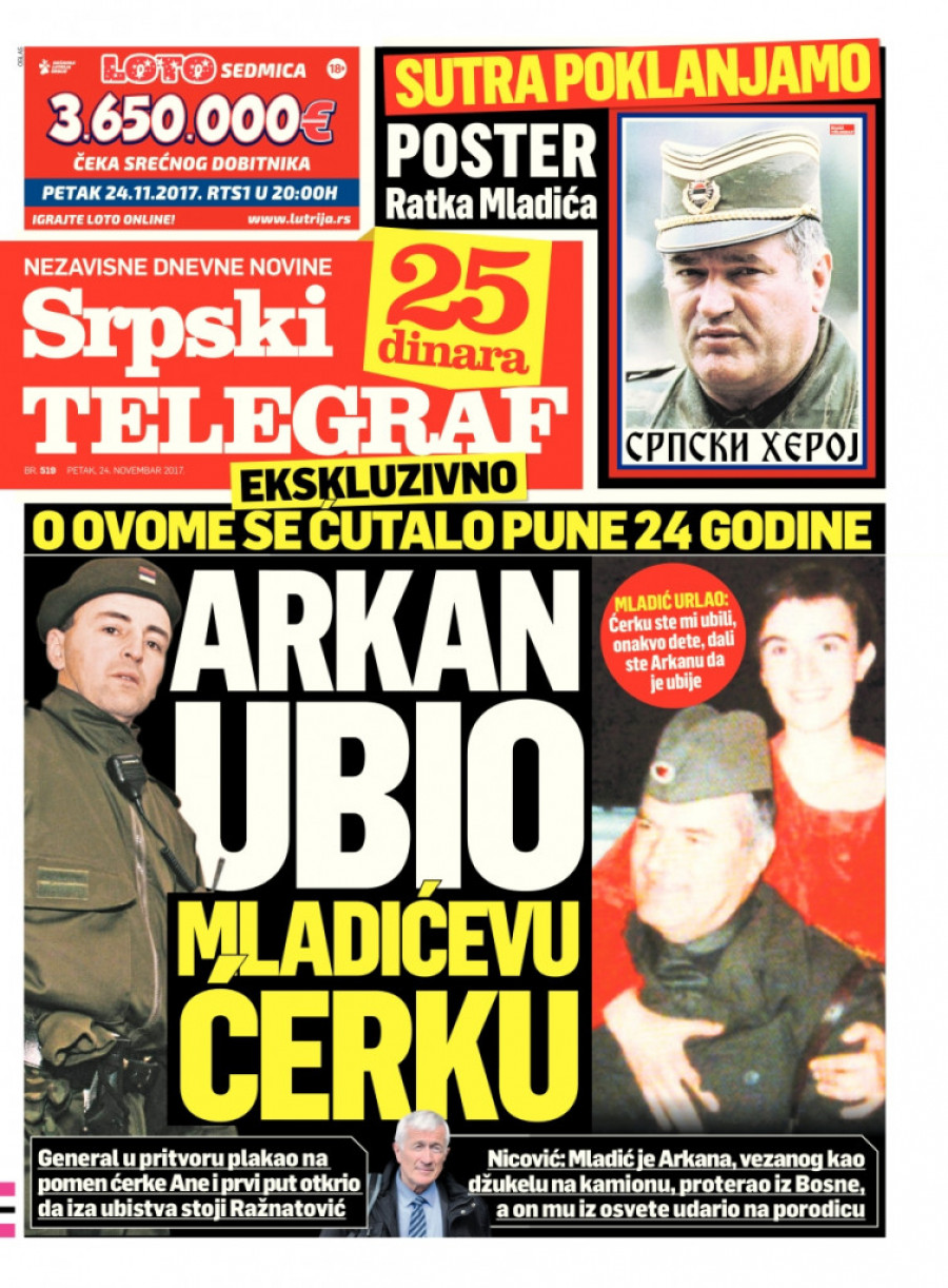 - Mladić je bukvalno proterao Arkana iz Bosne! Vezanog kao džukelu u prikolici kamiona, preterao ga je preko Drine i rekao mu: "Nemoj da ti je palo na pamet da si više ikad kročio u RS". To zaista više nikad nisu uradili ni Arkan ni njegovi ljudi. Nije isključeno da je Željko iz osvete i povređene sujete udario Mladića tamo gde će najviše da ga boli i ubio mu ćerku - kaže Nicović za Srpski telegraf.