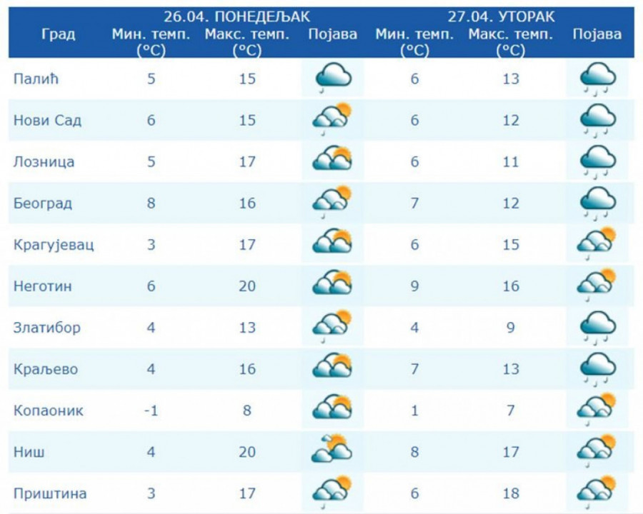 U Srbiji ujutro hladno, ponegde sa slabim prizemnim mrazem, a tokom dana malo do umereno oblačno, na severu, zapadu i jugozapadu mestimično s kišom ili lokalnim pljuskovima, saopštio je Republički hidrometeorološki zavod Srbije (RHZS).