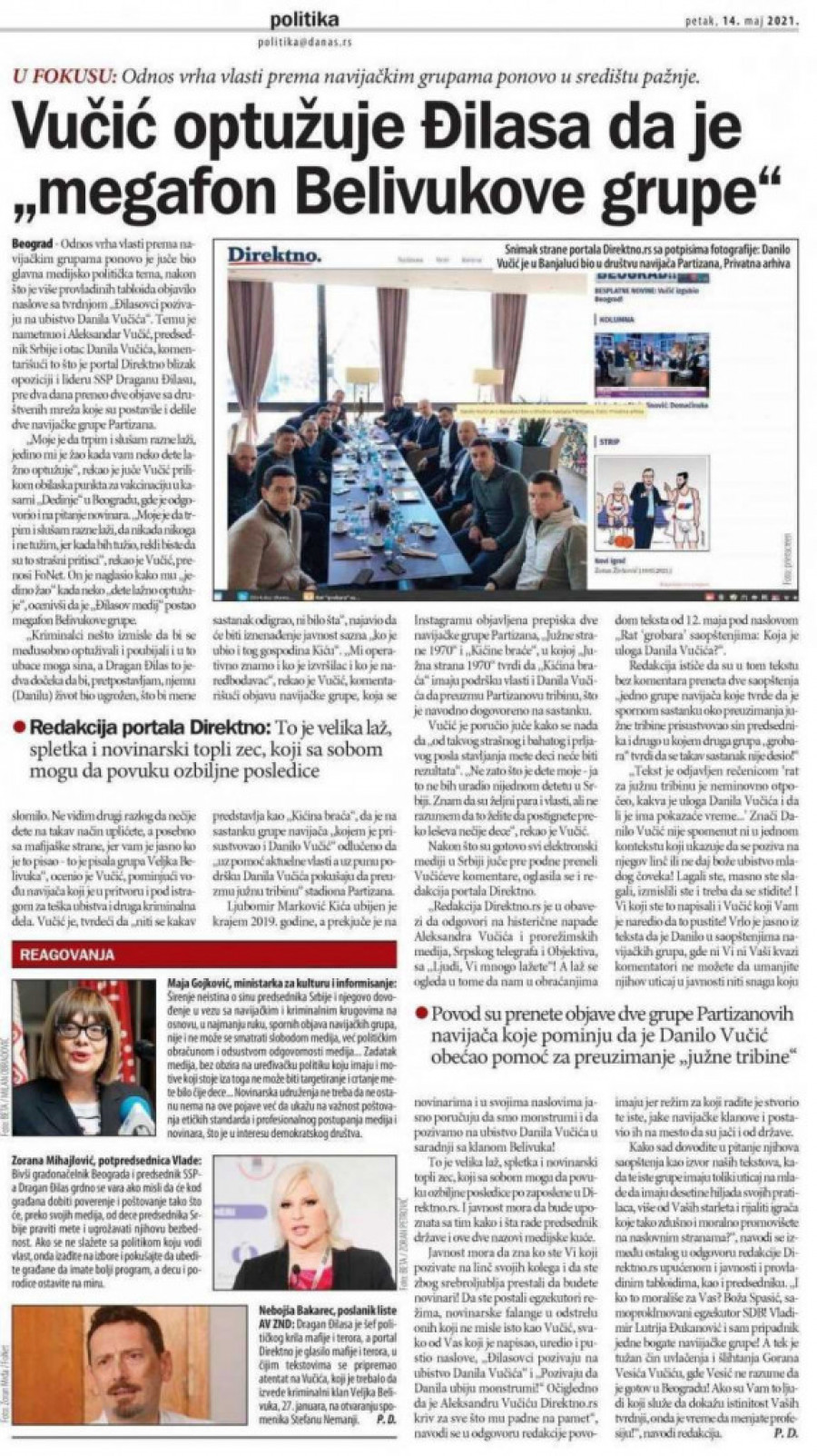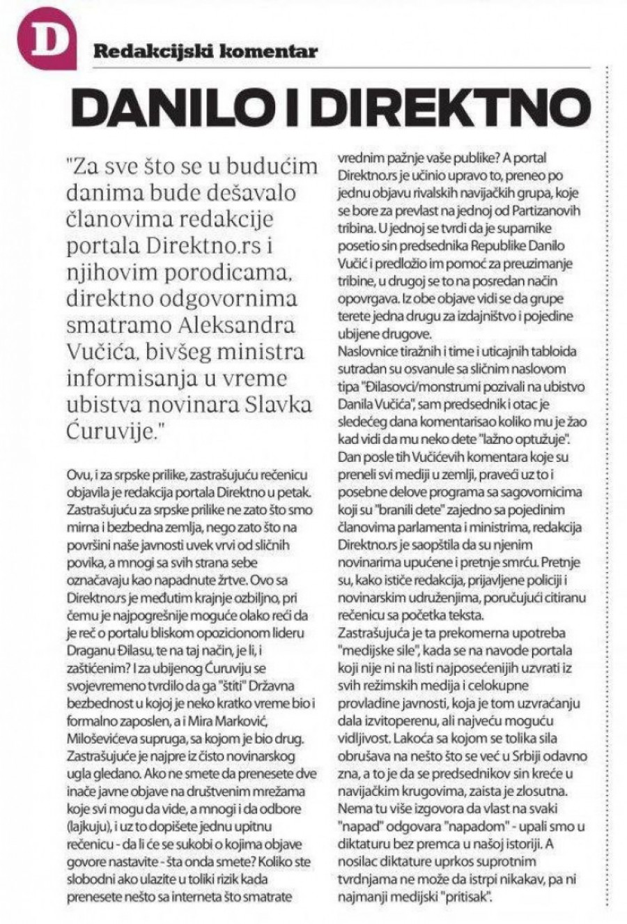 U jučerašnjem broju, u drugoj rečenici njihov novinar sam piše: "... komentarišući to što je portal Direktno, blizak opoziciji i lideru SPP Draganu Đilasu, pre dva dana preneo dve objave...".