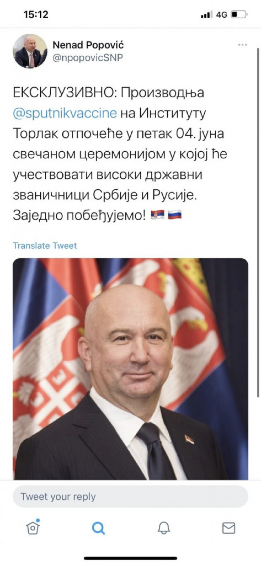 Foto: Tanjug/S. RADOVANOVIĆ- Proizvodnja Sputnjika V na Institutu Torlak otpočeće u petak 4. juna svečanom ceremonijom u kojoj će učestvovati visoki državni zvaničnici Srbije i Rusije. Zajedno pobeđujemo - napisao je Popović