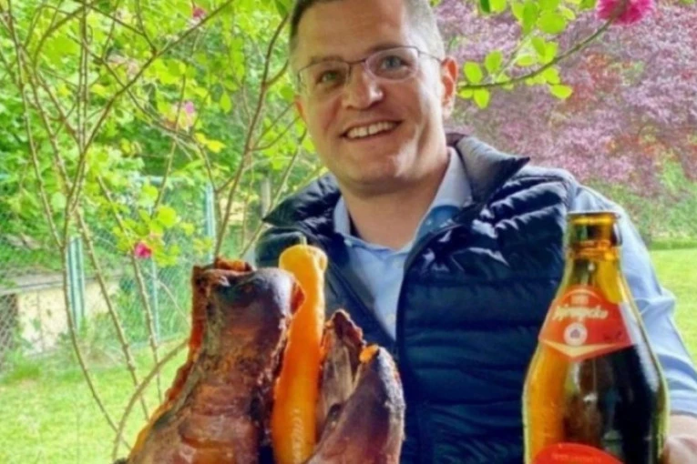 Foto: PrintscreenVuk Jeremić, lider Narodne stranke, objavio je fotografiju iz Pančeva na kojoj ispija pivo, a pored njega je na stolu praseća glava.