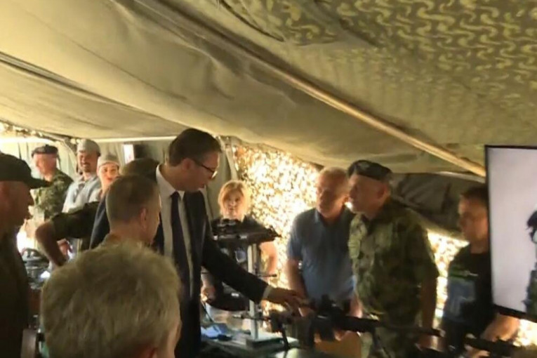Predsednik Srbije tokom obilaska razgovara sa okupljenima i komentariše prikazanu vojnu opremu.