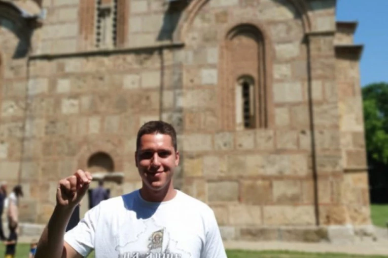 Na fotografiji je Danilo Vučić ispred manastira Gračanica, a na sebi nosi majicu na kojoj je prikazana južna srpska pokrajina uz natpis - Od duše se ne može oteti!