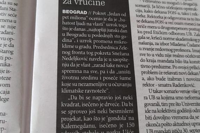 U dnevnom listu "Danas" od 25. juna objavljen je članak sa naslovom "Bahata vlast u Beogradu kriva za vrućine".
