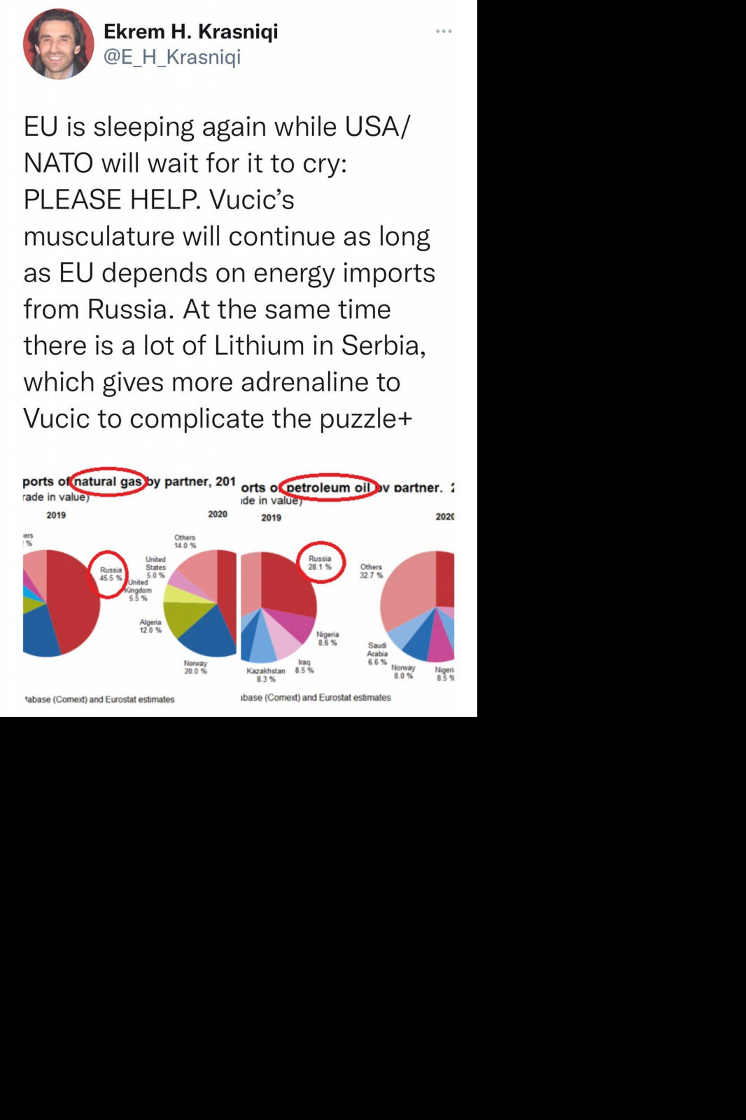 - Evropska unija ponovo spava dok ih Amerika/NATO čeka da zaplaču: Molim vas, pomozite. Vučićevi mišići će nastaviti da rastu sve dok Evropska unija zavisi od uvoza energije iz Rusije. U isto vreme u Srbiji ima puno litijuma koji Vučiću daje više adrenalin da zakomplikuje slagalicu - napisao je Ekrem H. Krasnići na svom tviter nalogu.