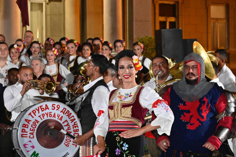 Predstojeći Dragačevski sabor trubača u Guči najavljen je večeras svečanim defileom ulicama Beograda par stotina trubača i članova kulturno-umetničkih društava u narodnim nošnjama.