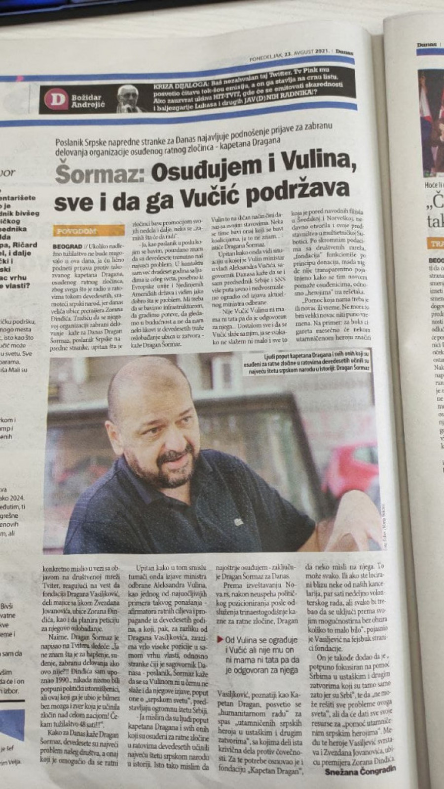 Na otvarajućoj, drugoj strani Đilasovog i Šolakovog kvazi medija je intervju sa Draganom Šormazom u kome se pominje i predsednik Srbije, a koji nosi naslov - "Šormaz: Osuđujem Vulina sve i da ga Vučić podržava".