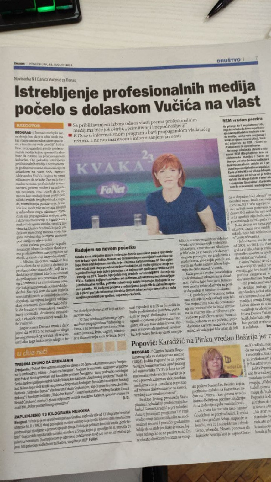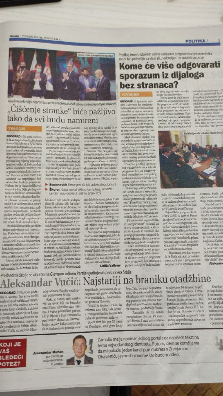 Tekst pod naslovom "Čišćenje stranke biće pažljivo da svi budu namireni", Danas se bavi SNS i njeni predsednikom, dok se i tekst "Kome će više odgovarati sporazum iz dijaloga bez stranaca" takođe bavi predsednikom države.