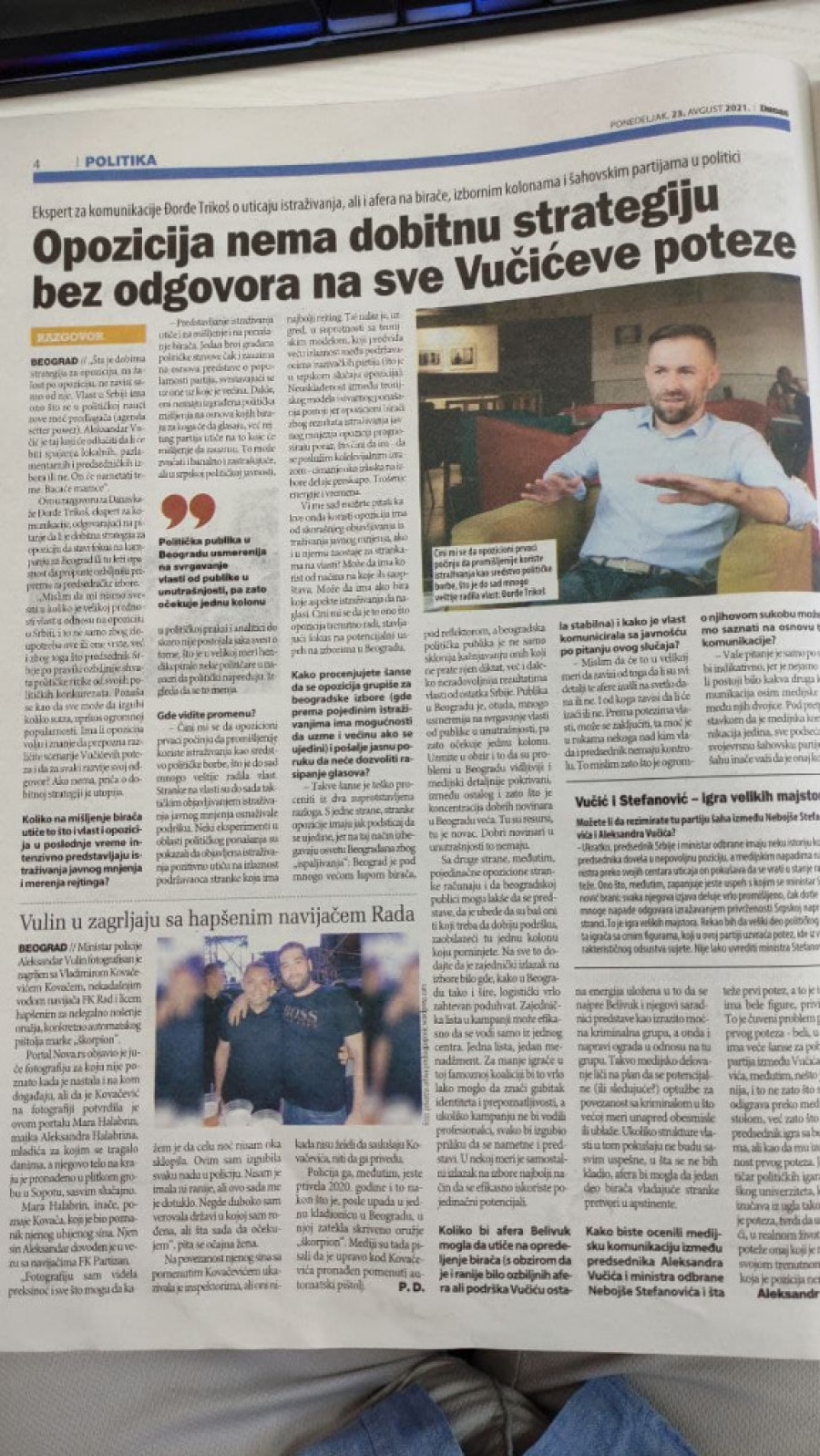 Tu, međutim, nije kraj, pošto je Vučić centralna ličnost i intervjuu sa Đorđem Trikošem, ekspertom za komunikacije na strani četiri Đilasovog i Šolakovog kvazi-medija.