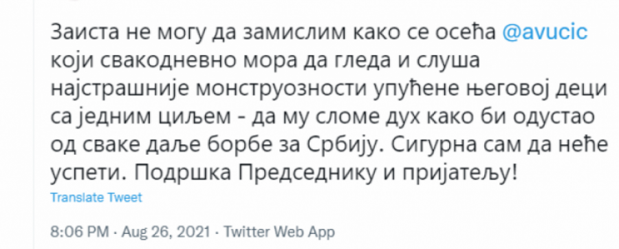 - Zaista ne mogu da zamislim kako se oseća Aleksandar Vučić koji svakodnevno mora da gleda i sluša najstrašnije monstruoznosti upućene njegovoj deci sa jednim ciljem - da mu slome duh kako bi odustao od svake dalje borbe za Srbiju. Sigurna sam da neće uspeti. Podrška Predsedniku i prijatelju! - napisala je premijerka Ana Brnabić.