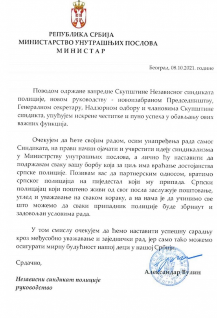 Čestitku ministra Vulina upućene Nezavisnom sindikatu policije prenosimo u celosti: