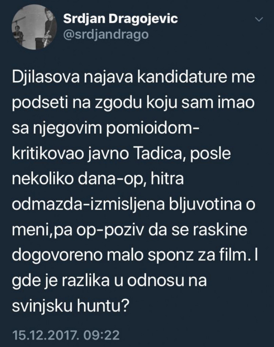 - Đilasova kandidatura me podseti na zgodu koju sam imao sa njegovim pomioidom: kritikovao sam javno Tadića, posle nekoliko dana - op, hitra odmazda - izmišljena bljuvotina o meni pa poziv da se raskine dogovoreno malo sponzorstvo za film - napisao je Dragojević u svom tvitu.