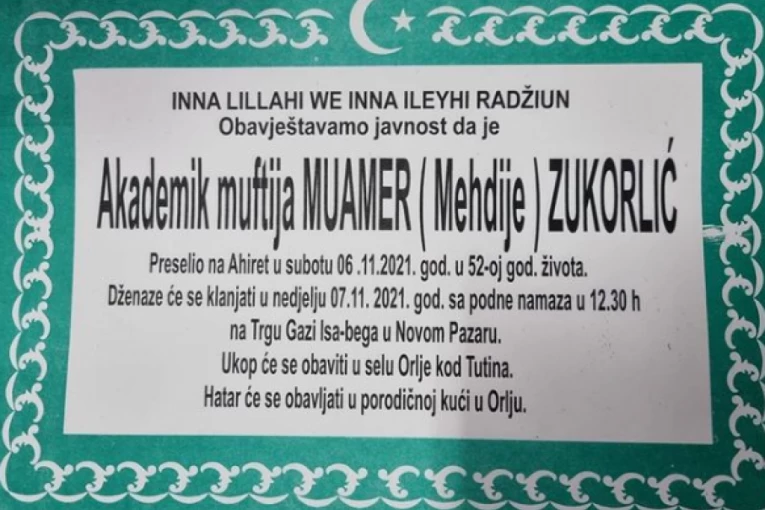 - Dženaza akademiku muftiji Muameru ef. Zukorliću, koji je preselio na ahiret u subotu 6. 11. 2021. godine, klanjat će se u nedelju, 7. novembra nakon podne namaza u 12.30 h na Trgu Gazi Isa-bega u Novom Pazaru, a ukop će se obaviti u selu Orlje kod Tutina. Hatar će se obavljati u porodičnoj kući u Orlju' - saopšteno je iz Stranke pravde i pomirenja.