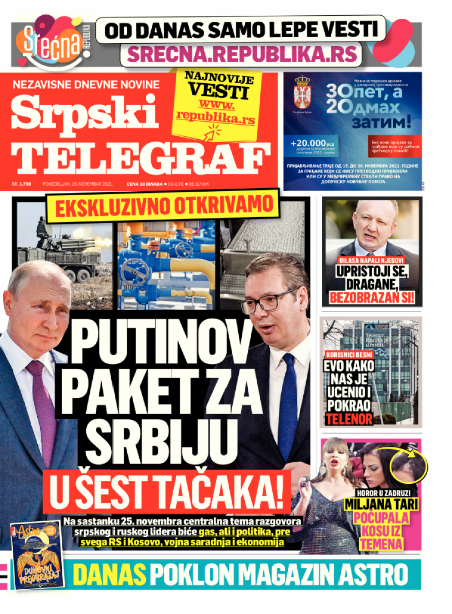 Srpski telegraf u štampanom izdanju za 15. novembar donosi pregršt važnih i interesantnih priča: