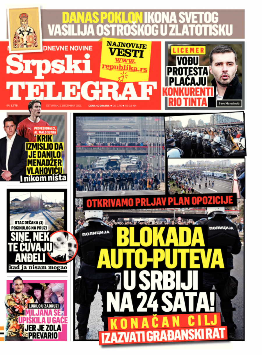 - Nikoga tu zaista ne zanima zaštita životne sredine. Opozicija u protestima vidi šansu da okupi ljude koji su nezadovoljni i ojača svoje pozicije. Plan je da se tenzije podižu do aprila, da se blokira zemlja, da sve stane. Očekujemo da će se ove akcije isplatiti i da će na izborima doneti značajnu podršku birača - otkriva izvor Srpskog telegrafa iz opozicionih krugova.