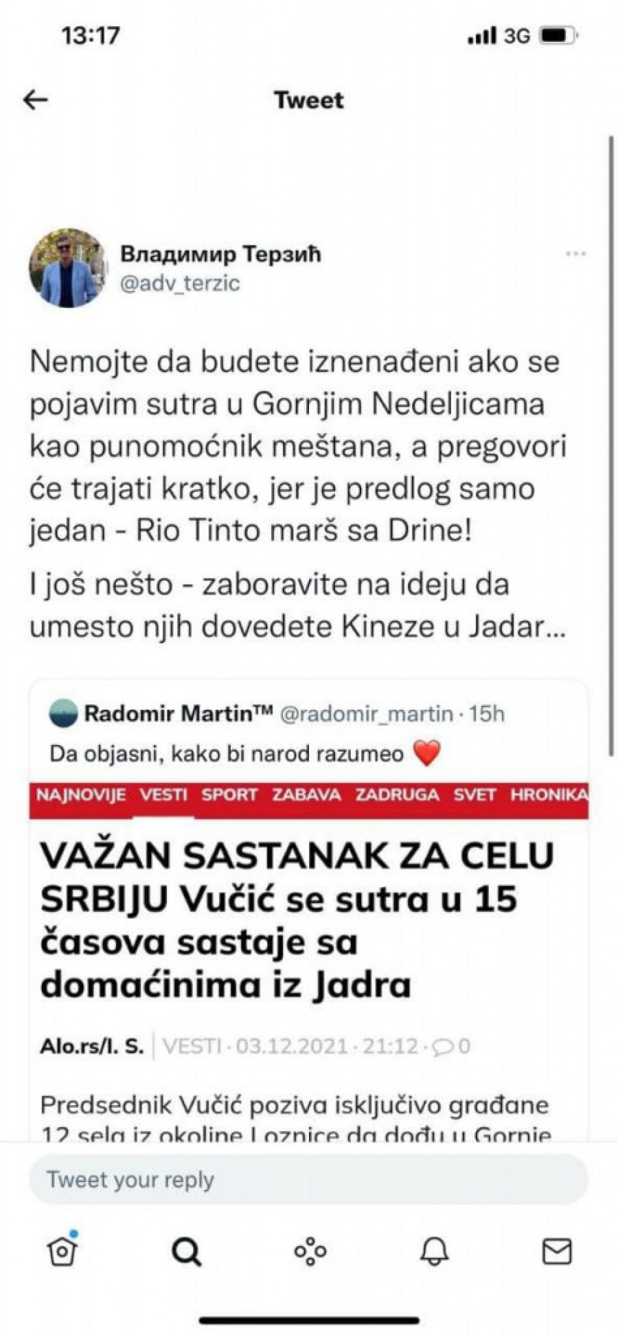 - Nemojte da budete iznenađeni ako se pojavim sutra u Gornjim Nedeljicama kao punomoćnik meštana, a pregovori će trajati kratko, jer je predlog samo jedan - Rio Tinto marš sa Drine - pretio je juče Vladimir Terzić na Tviteru, a danas pozira kod Sava centra s pedofilom Vladimirom Vuletićem.